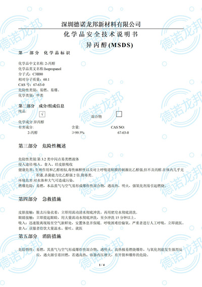 IPA清洗剂-异丙醇-MSDS-用途_密度-2丙醇CAS【67-63-0】安全技术资料-深圳德诺龙邦新材料有限公司